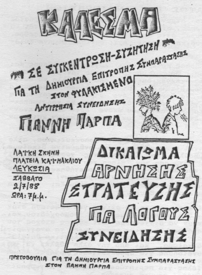 Τέλος πάντων με τα παιδιά της Ε.Δ. καθώς και με άλλα άτομα του γενικότερου αντιεθνικιστικού “χώρου” στη Λεμεσό και Λευκωσία, φτίαχνεται μια πρωτοβουλία που σκοπό της έχει τη σύσταση μιας επιτροπής συμπαράστασης. Ερχόμαστε σ' επαφή με το Πάρπα στη φυλακή όπου το άτομο τα είχε παίξει διότι κόντευε ενάμησι μήνας στη φυλακή και φωνή συμπαράστασης από πουθενά. Γράφει μια δήλωση την οποία σαν πρωτοβουλία αναλαμβάνουμε να διακινήσουμε μαζί και μια φφίσσα που καλεί για συγκέντρωση για τη δημιουργία της επιτροπής. Η δήλωση του Πάρπα καθώς και η απολογία του στο δικαστήριο μας κάνει να καταλάβουμε ότι ο άνθρωπος ούτε άσχετος αλλά ούτε και Ιεχωβάς [είναι] (παρόλη τη συμπάθεια μας και ταυτόχρονα απέχθεια μας προς αυτό το κίνημα των αλλόπιστων). Αντίθετα όπως είπε τόσο στο δικαστήριο όσο και στη δήλωση του ήταν για κείνο “θέμα αρχών και συνείδησης”. Και ποιες είναι οι αρχές του και ποια η συνείδηση του είναι ξεκάθαρο άμα διαβάσει κανείς τη δήλωσή του.1)